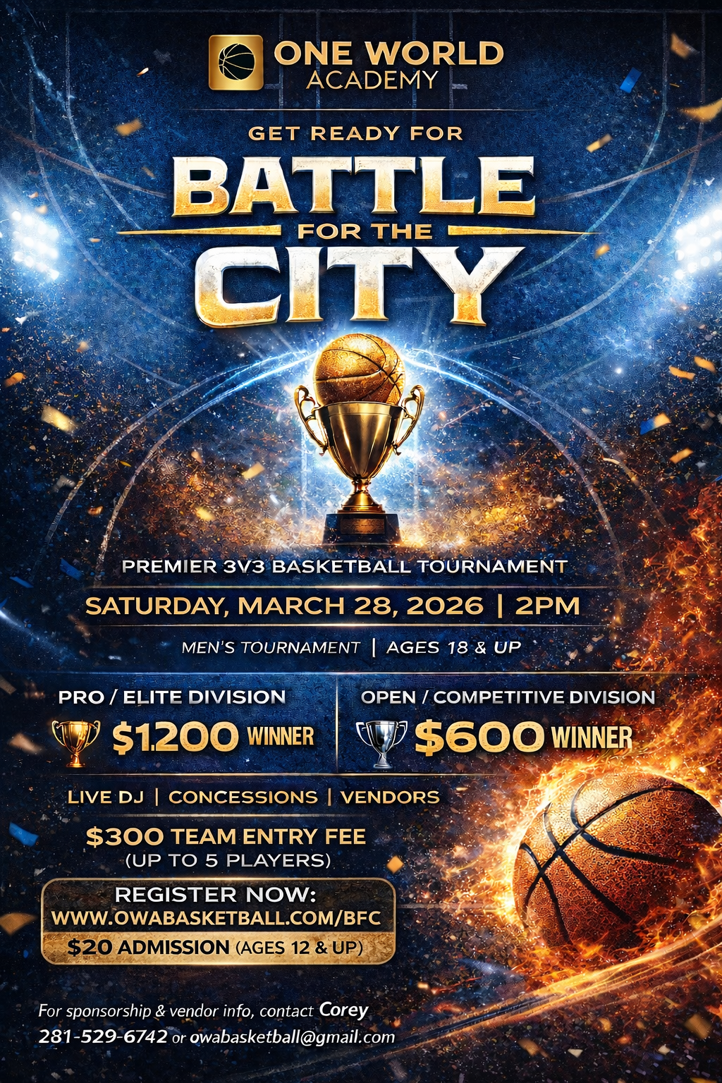 One World Academy presents Battle for the City, a high-energy Premier 3v3 Basketball Tournament bringing the city’s best talent together for pride, competition, and serious cash prizes.
